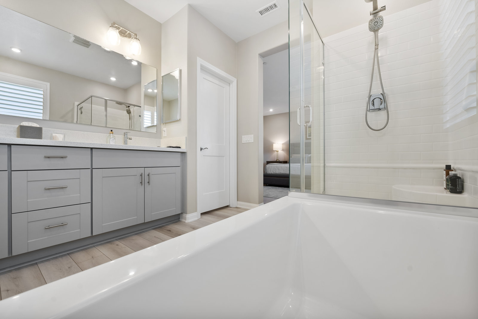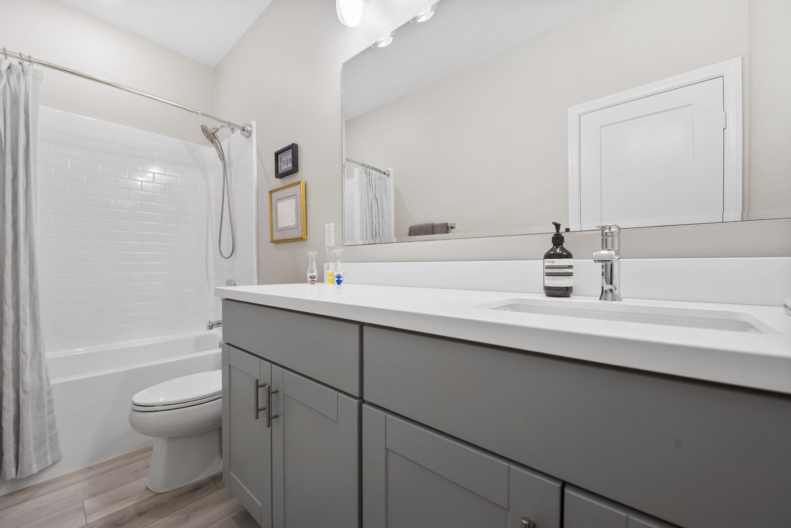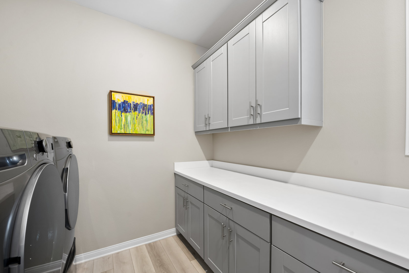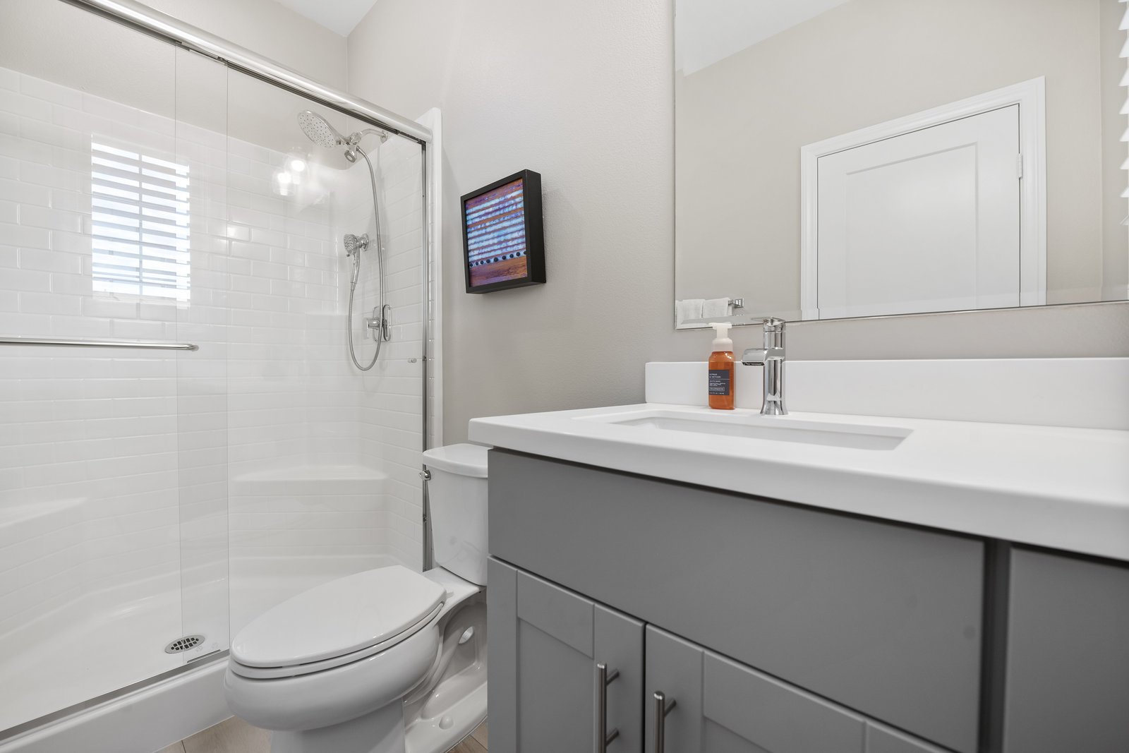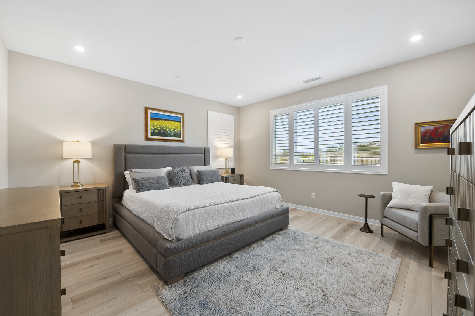 Upstairs, the expansive primary suite offers a luxurious retreat with a deep soaking tub, separate walk-in shower, private water closet, and a generous walk-in closet. A sizable secondary en-suite bedroom—currently used as a media room—adds flexibility, while two additional bedrooms share a well-appointed full bath. The large upstairs laundry room includes side-by-side washer and dryer, ample cabinetry, and plenty of folding space. The home is loaded with thoughtful upgrades such as custom plantation shutters on every window, blackout shades in three bedrooms, increased LED recessed lighting in bedrooms, kitchen, and family room, additional cabinetry in the laundry room, upgraded shower fixtures in all bathrooms, and pre-wiring for ceiling fans in the primary suite and main living area. Energy-efficient features include 10 owned solar panels and a 240V outlet in the garage for your electric vehicle charger.